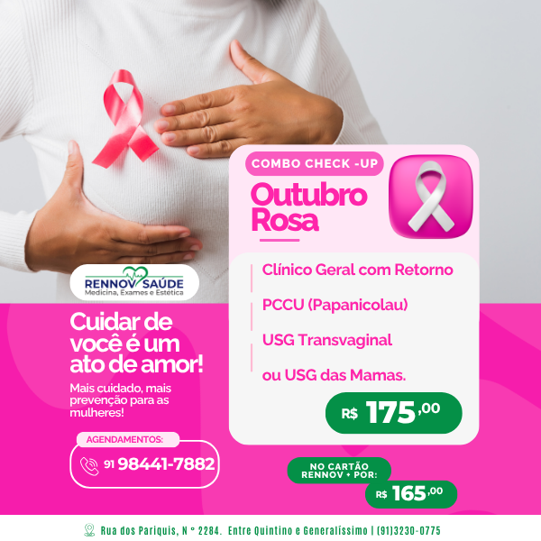 Pensando em você, preparamos um Combo Check-up Especial Outubro Rosa para mais cuidado e prevenção: